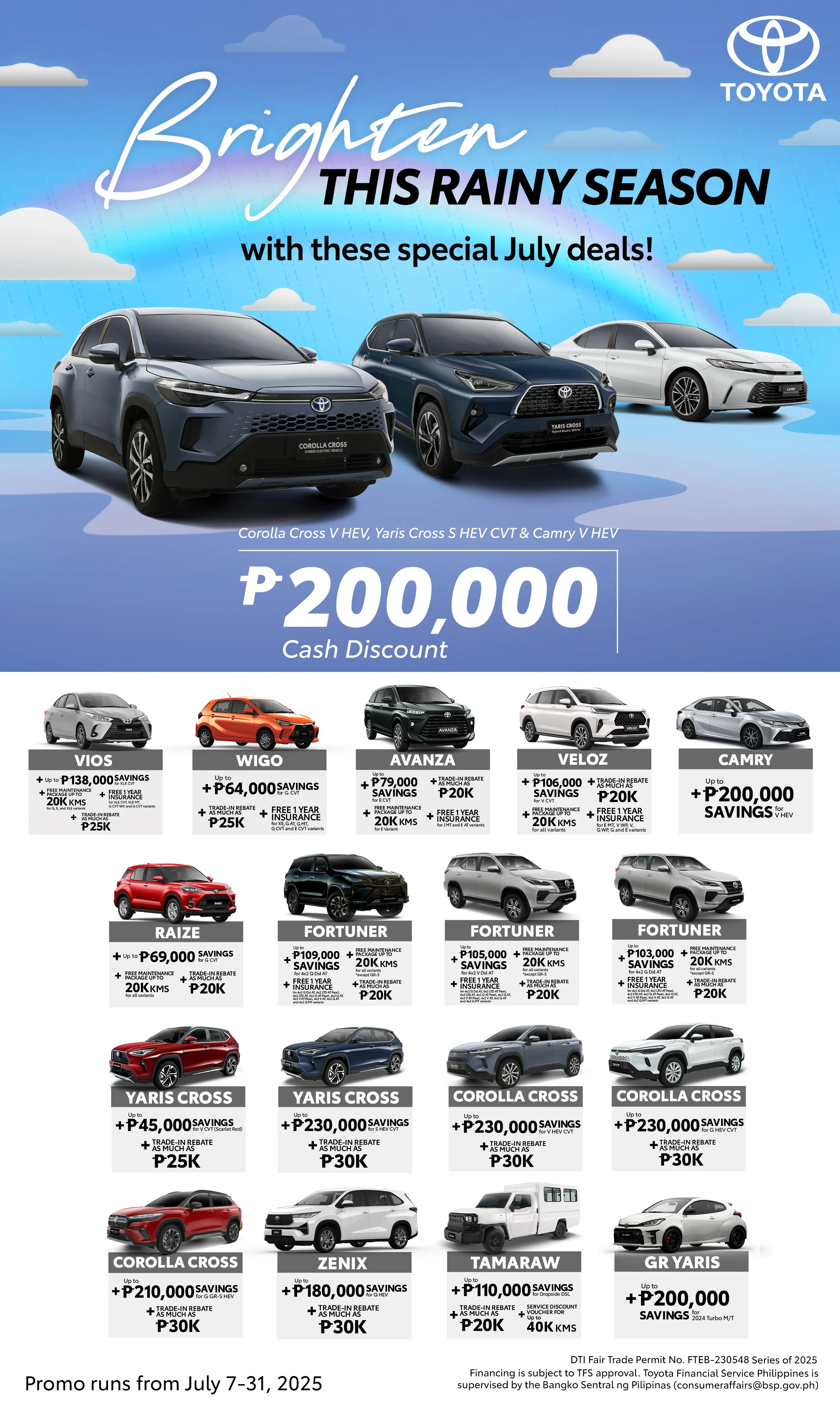 • All variants of Rush, Altis, and Wigo sold and released from July 7 – 31, 2025 are qualified for the Service Discount Voucher of P1,200 (VAT inclusive) for 1K to 30K km. Periodic Maintenance Service (PMS).